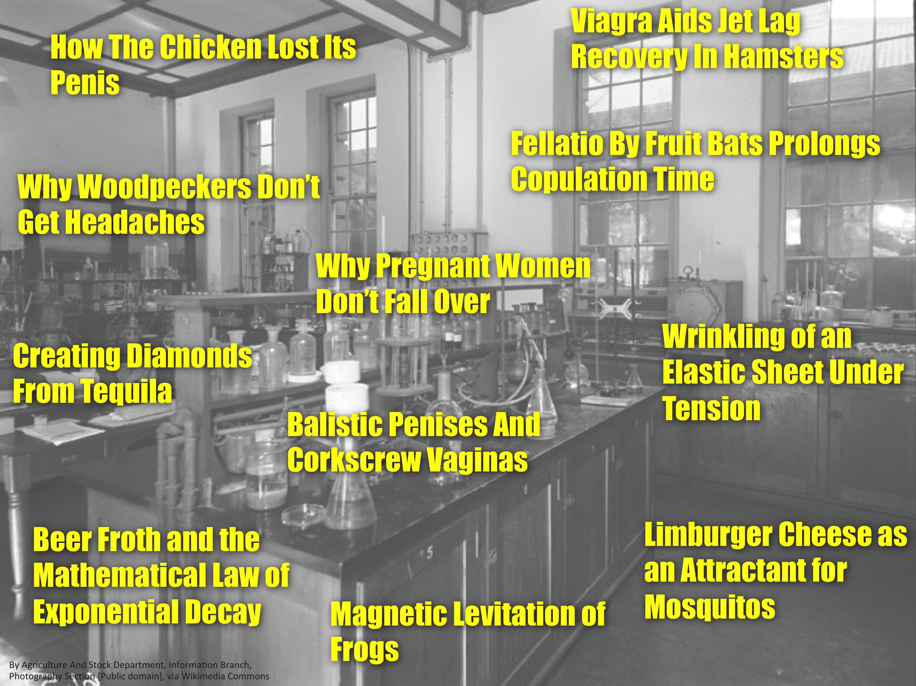 In the next 20 minutes or so I will be regaling you with some of the sillier stories from science and scientific research. I’ll take you on a journey through real recent research, from animal sex, penises and vaginas, through to findings about wobbly pregnant women, levitating frogs and cheesy mosquitos. I’ll mention Sarah Palin’s now infamous quote about fruit fly research but hopefully leave you on a positive note that scientists aren’t always out to waste your tax money.