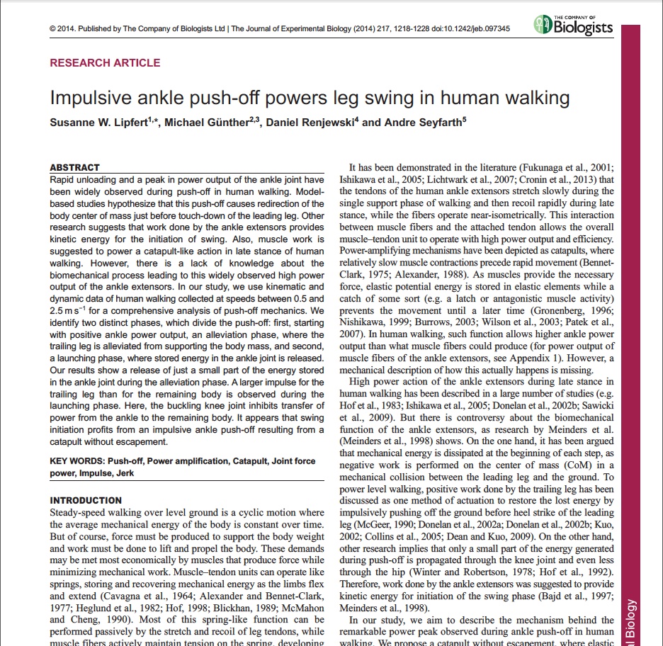 Lipfert et al., 2014, Impulsive ankle push-off powers leg swing in human walking, J Exp Biol – pdf freely available from Oregon State University here