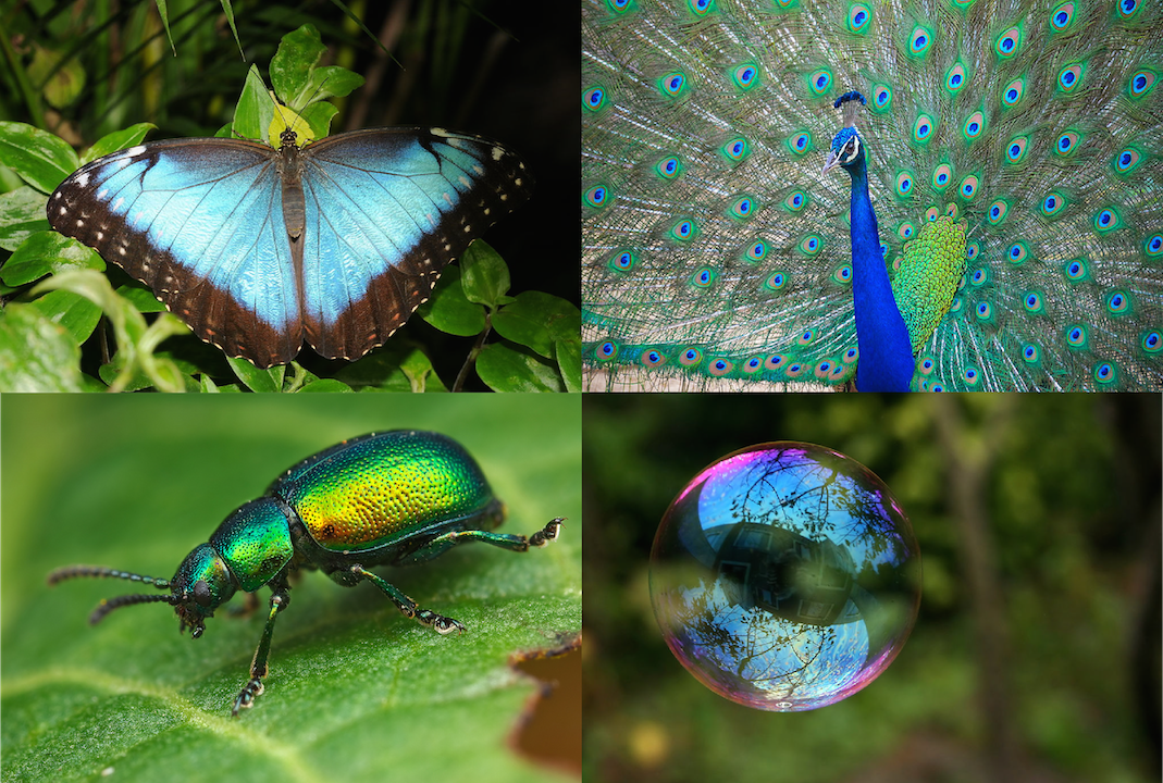 Credits: Morpho (Photo : Thomas Bresson); Peacock (Photo : Manish Kumar); Beetle (Flickr|sreb1); Bubble (Brocken Inaglory)